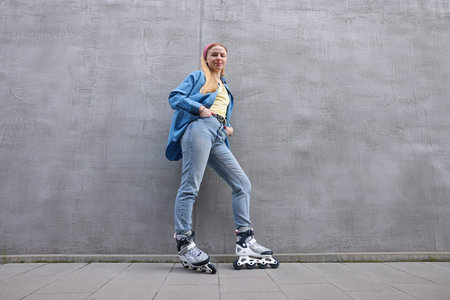 Beautiful young woman with roller skates near gray wall outdoors, low angle view