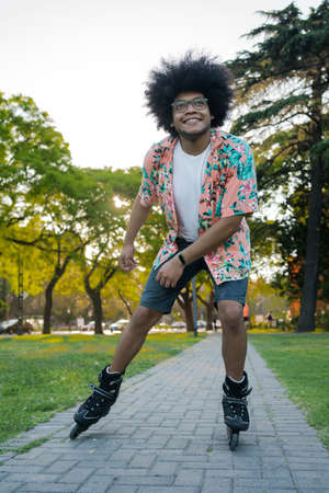 closeup of a young caucasian man outdoors wearing quad roller skates using his smartphone