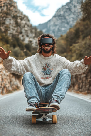 A person with long hair wears a virtual reality headset while sitting on a skateboard, surrounded by stunning mountains. They are smiling and extending their arms, fully immersed in an exciting experience.
