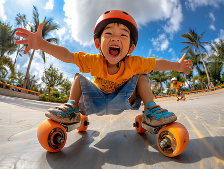 Incline Skating child, learning a new sport activity, outdoor, summertime