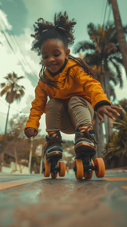 A young child boy is riding a roller skates down a road. The child is happy and smiling. Concept of joy and excitement as the child enjoys the thrill of rollerskating