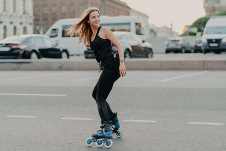 Sideways shot of active young woman in good physical shape along city streets looks happily behind wears black sportsclothes leads healthy lifestyle. Recreation and hobby concept