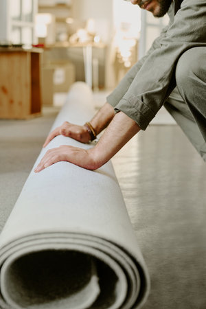 Young adult man rolling out carpet on floor during moving and renovation, hands pressing fabric, partial body visible, home interior in background, focused on action