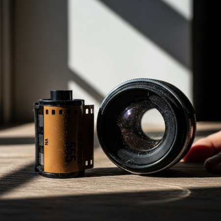 close up of a film in the afternoon golden hour on a table