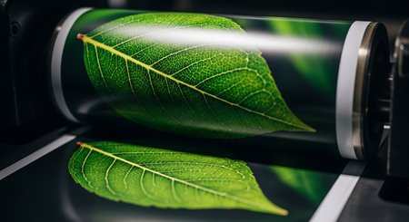 Image shows a printing press cylinder with a green leaf image printed on it, and a printed sheet below with the same leaf image. The image is a close-up, showing the details of the leaf veins and the printing process.