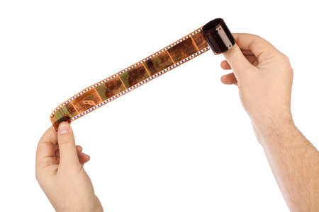 Photographic film in hands isolated on white background