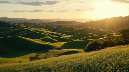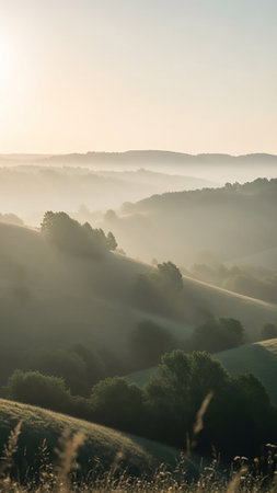A stunning view of rolling green hills at sunrise, bathed in soft light that creates a peaceful ambiance, showcasing the beauty of nature. Perfect for tranquil settings.