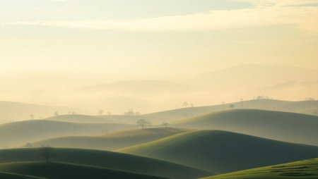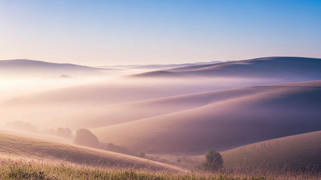 A serene and tranquil landscape featuring soft rolling hills under a calm sky at dusk. The gentle gradients and atmospheric mist create a peaceful and inviting scene.