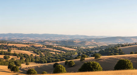 This breathtaking landscape captures rolling hills in soft earth tones under a clear blue sky. The gentle undulations create a serene and tranquil atmosphere ideal for nature lovers.