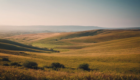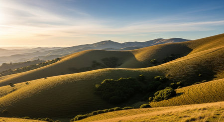 Gentle, rolling hills are bathed in the warm, golden light of the setting sun. The landscape is a mix of green and dry grasses, creating a textured surface with soft shadows that accentuate the undulating contours. In the distance, a range of hazy mountains stretches across the horizon under a clear blue sky. The overall mood is peaceful and serene.