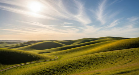 Stunning spring landscape rolling hills and pathway through Tuscany s lush green meadows at sunrise