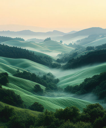 Gentle, rolling hills bathed in the soft light of dawn, partially obscured by a thick layer of ethereal fog. The landscape features a mix of green and brown fields, with a subtle winding path visible on one of the slopes. The atmospheric haze creates a serene and tranquil mood, emphasizing the vastness and natural beauty of the scene.