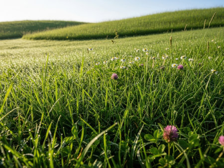 Delicate showing close-up low angle view of a lush green meadow with dew drops and scattered yellow and white...