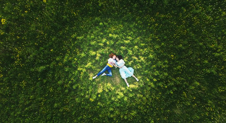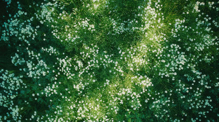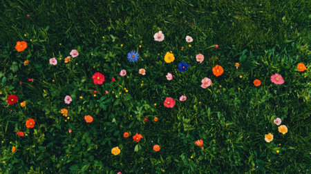 A stunning top-down view of a colorful array of wildflowers scattered across a lush green grassy field, showcasing the beauty of nature and biodiversity.