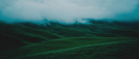 A captivating misty green hillside landscape showcasing soft grass and gentle rolling terrain, evoking a serene and tranquil atmosphere.