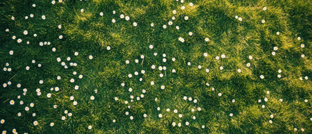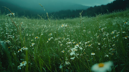 Freshly mown lawn adorned with vibrant daisies under soft lighting