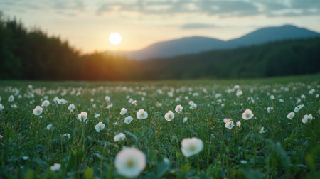 A stunning daisy-filled meadow is illuminated by the warm, golden light of the setting sun, casting a serene and tranquil atmosphere across the peaceful landscape
