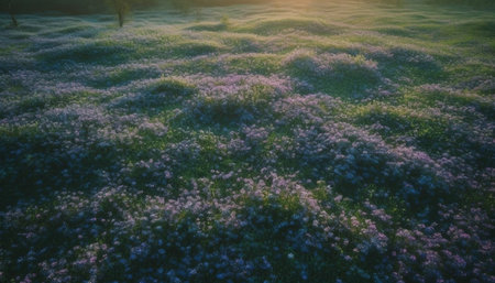 A stunning view of a wildflower meadow at dusk, showcasing a variety of colorful blossoms under soft sunlight. This serene outdoor landscape embodies tranquility and natural beauty.