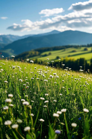 A detailed view of a vibrant green meadow abundant with small yellow and white wildflowers, showcasing natural...