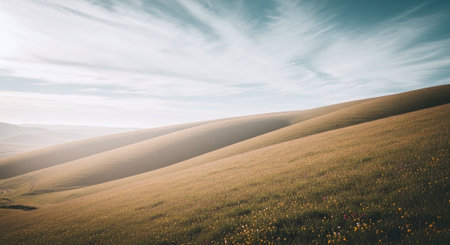 Digital illustration capturing expansive freedom through panoramic composition and implied gentle breeze dynamics. Perfect for mindfulness apps, eco-friendly branding, serene wallpapers, or nature-inspired designs appealing to wellness professionals and landscape artists. Emphasizes harmonious color gradients and open spatial depth for versatile applications in print... AI-generated illustration.
