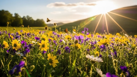 Sunlit meadow with vibrant wildflowers at sunset. Peaceful, idyllic scene.
