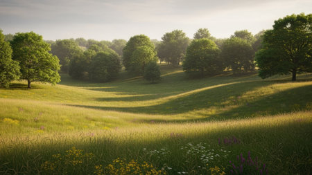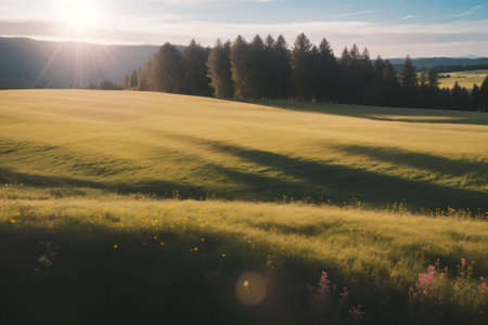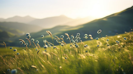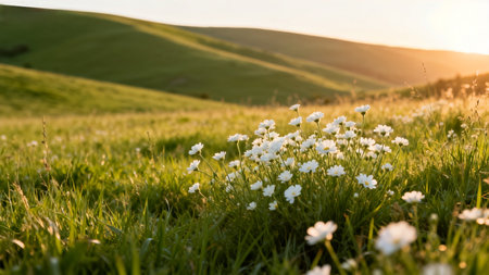 Golden hour sunlight bathes a vast field of tall green grass and scattered wildflowers, creating a hazy, serene...