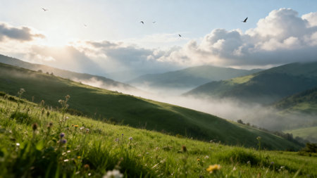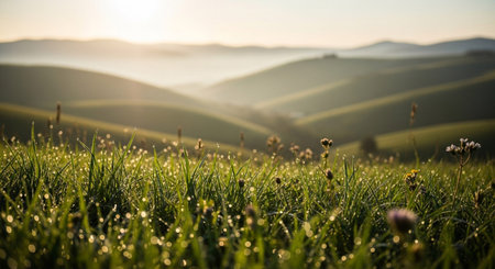 A close-up view of lush green grass glistening with countless dew drops, catching the soft, golden light of sunrise. The scene is set against a backdrop of gently rolling hills, partially veiled in a soft mist, creating a serene and tranquil atmosphere. The warm sunlight filters through the haze, illuminating the tiny water droplets and highlighting the vibrant green of the grass. evokes a sense of peace and the fresh beauty of a new day in the countryside.