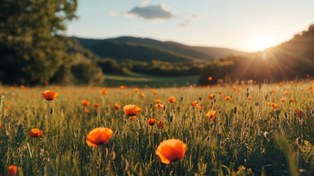 Fields of vibrant orange poppies stretch across a lush valley as the sun sets behind rolling hills, casting a warm glow on the horizon and illuminating the natural beauty.