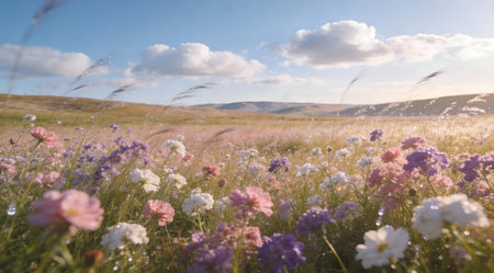 Sunlit meadow with vibrant wildflowers and dew-kissed grass