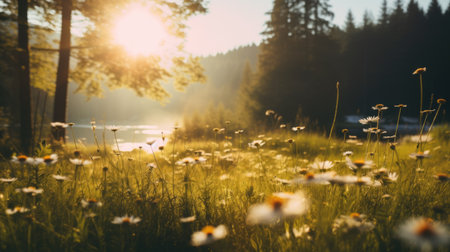 a field of daisies basks in the warm sun, reminiscent of romantic riverscapes. this naturalist aesthetic captures the beauty of nature as sunrays gently illuminate the scene. inspired by heiner luepke's atmospheric woodland imagery, this norwegian nature photograph showcases a captivating blend of light, with shades of white and amber. ai generated