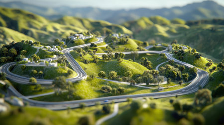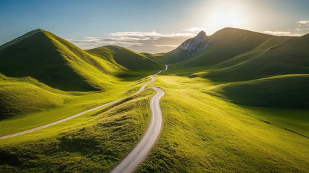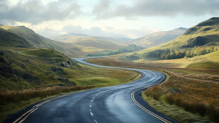 A picturesque view of a winding road through lush green hills, showcasing the beauty of nature and perfect for travel and adventure themes.