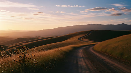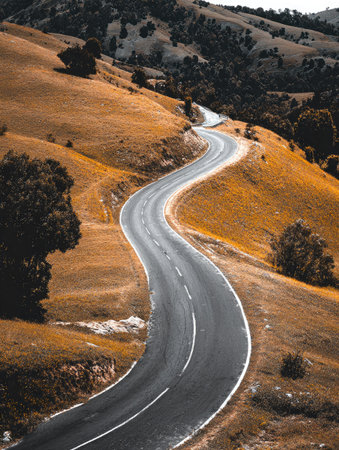 An asphalt road curves through golden hills, suggesting travel and exploration. The image displays a long, winding pathway with a natural composition. The natural lighting and earthy tones create a serene mood, suitable for projects related to landscapes, transportation, or travel narratives. It could be used in various commercial or editorial applications.