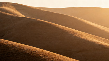 This breathtaking landscape captures rolling hills in soft earth tones under a clear blue sky. The gentle undulations create a serene and tranquil atmosphere ideal for nature lovers.