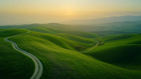 Stunning spring landscape rolling hills and pathway through Tuscany s lush green meadows at sunrise