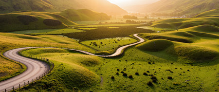 A cyclist rides along a winding road, amidst lush green hills under the soft glow of the setting sun. The scene evokes a sense of freedom, adventure, and the beauty of the natural landscape. Perfect for illustrating travel, outdoor activities, and active lifestyles.