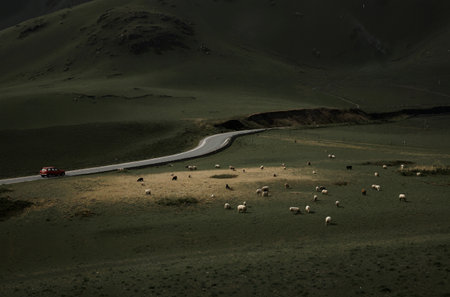Mongolian landscape with herd of sheep on the road.