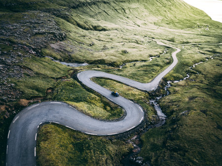 Aerial view of a winding road in the green grassy mountains