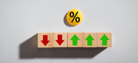 Up and down, Arrow Symbol, up and down. Increases and decreases. Business concept. A red cube with the words Up and Down spinning. Gray background. Copy space flat lay.