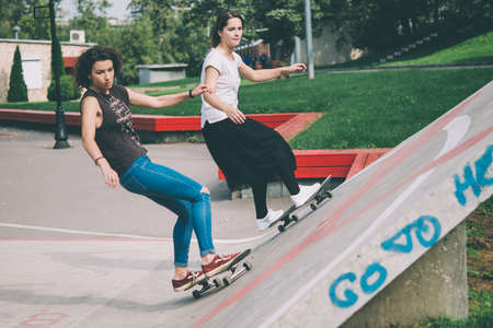 Two young girls enjoy skateboarding in the park in summer. Active live and sport concept. Toned picture