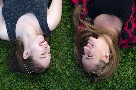 Top above high angle view portrait of attractive cheerful partners friendship lying on grass peaceful relax fresh air free time outdoors