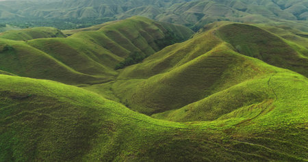 Aerial view of the undulating hills of Sumba Island, Indonesia, showcasing vibrant green grass, a winding path, and the natural beauty of the Indonesian landscape
