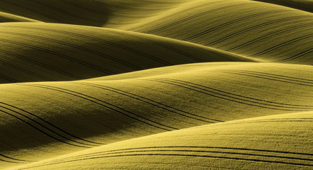 Rural spring agriculture texture background. Yellow rape field waves hills in South Moravia, Czech Republic. Yellow fields landscape
