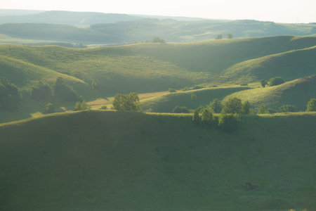 Evening light and spring greenery of hills and mountain slopes, panoramic view