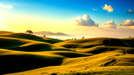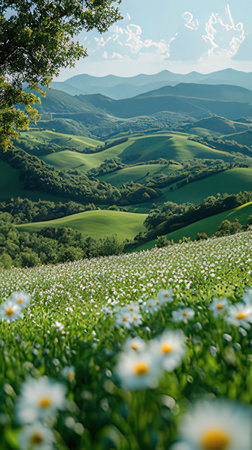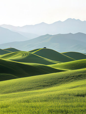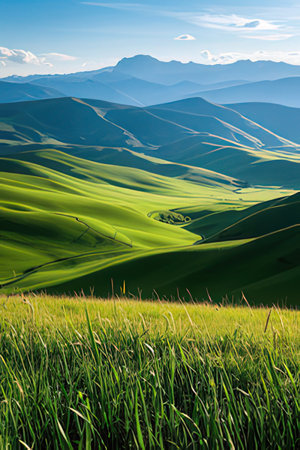 Beautiful landscape with rolling hills and green grass.