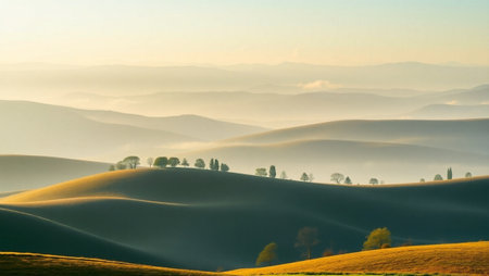 Misty morning in the hills of Tuscany, Italy.