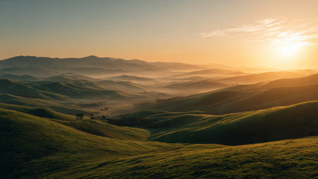 Majestic sunrise over green hills.