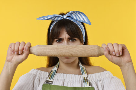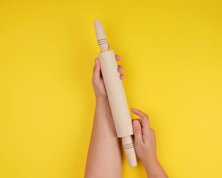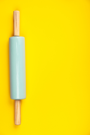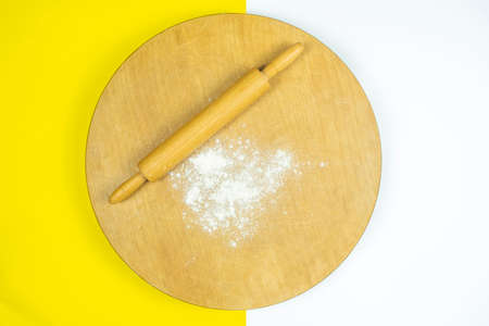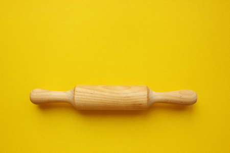 A rock for a dough made of wood on a yellow background. Cooking and baking. cookery. View from above. Copy space. The scay for the dough is crushed from below