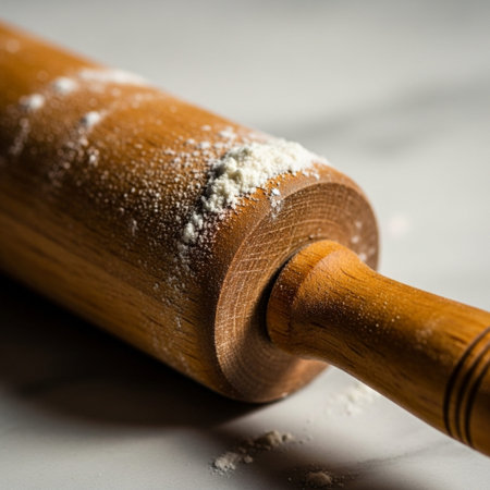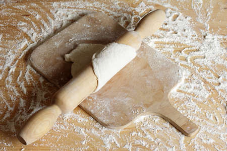 Close-up low angle view of an old-fashioned wooden rolling pin on rolled out dough or pastry resting at an oblique angle with the handle towards the camera and shallow dof
