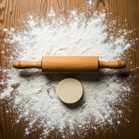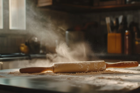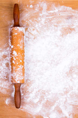 Spilled white flour and wooden rolling pin at the kitchen table. Space place to paste text / title