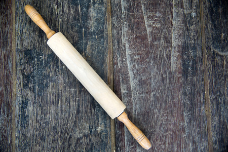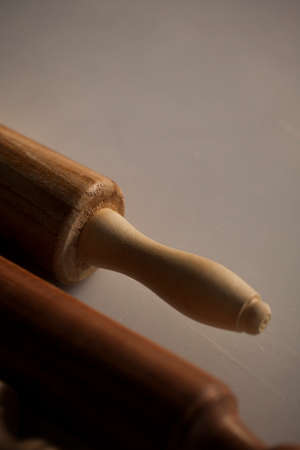 Close up of rolling pin lying on wooden table. Kitchen equipment in close up.